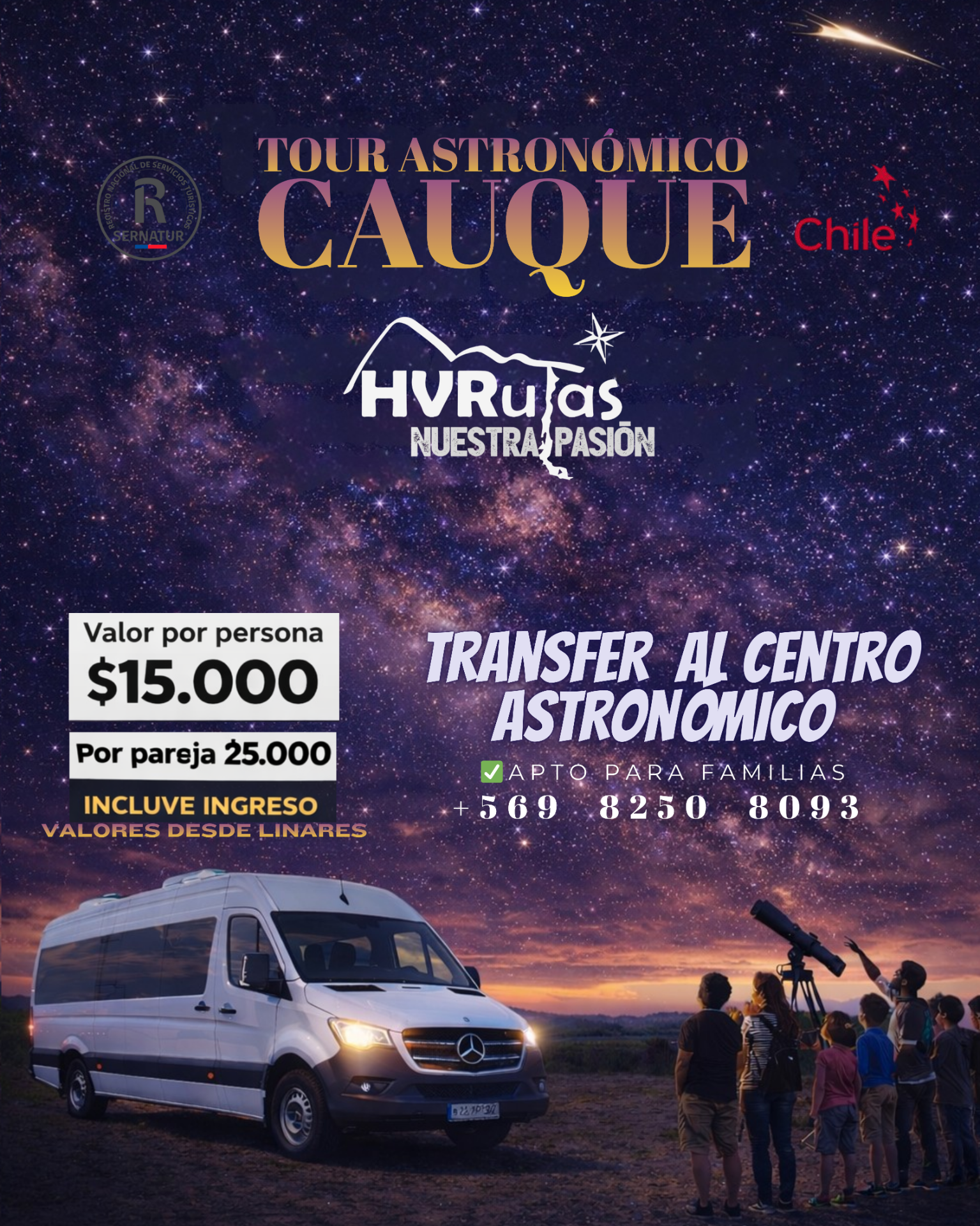Por eso hemos creado este Tour Astronómico CAUQUE, una experiencia pensada para toda la familia, donde combinamos traslado seguro, naturaleza y conocimiento bajo uno de los cielos más privilegiados del sur de Chile.