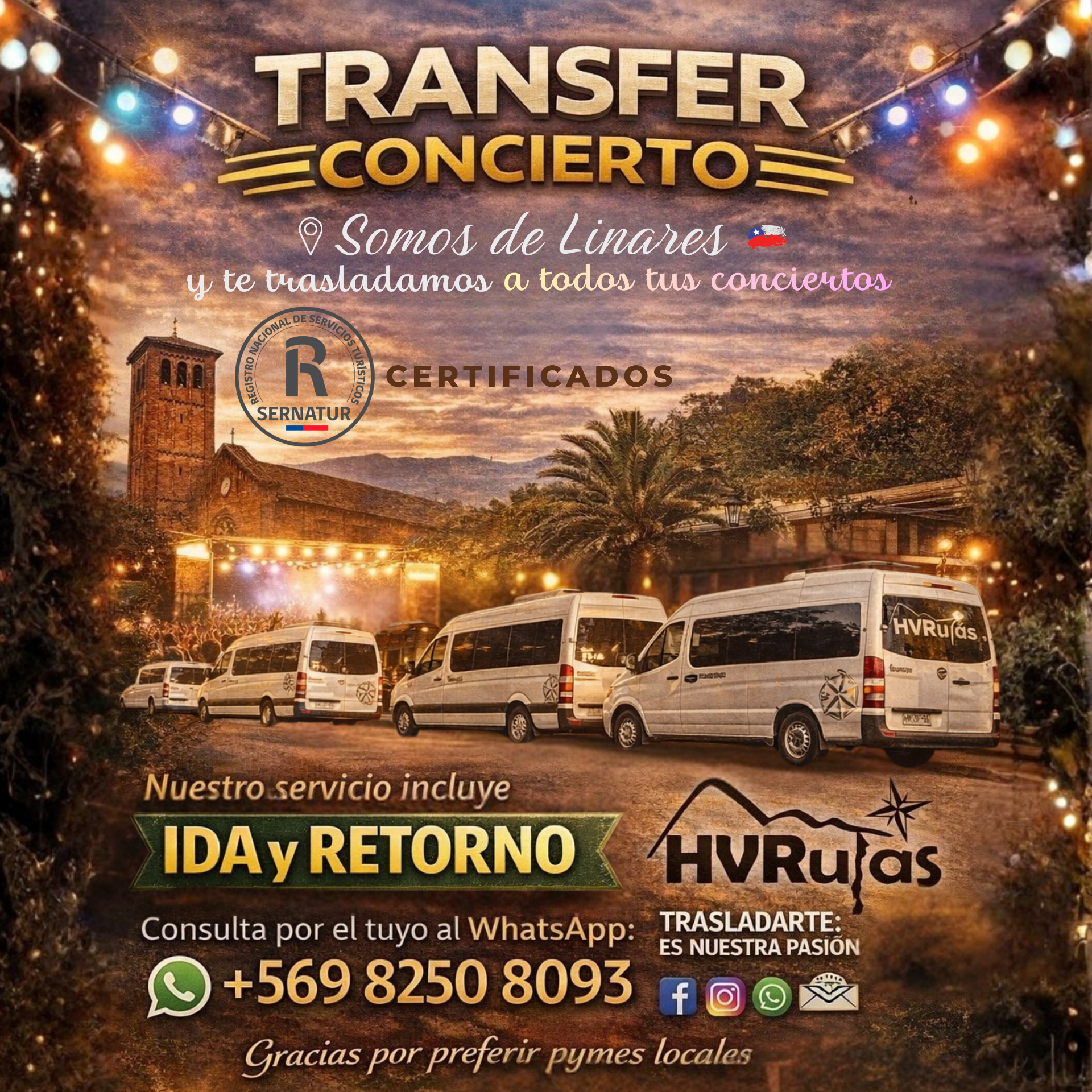 En HVRUTAS, desde el 2024 incorporamos el servicio de traslados a conciertos para que la comunidad de Linares y sus alrededores también puedan disfrutar de sus artistas favoritos con total tranquilidad 🙌
